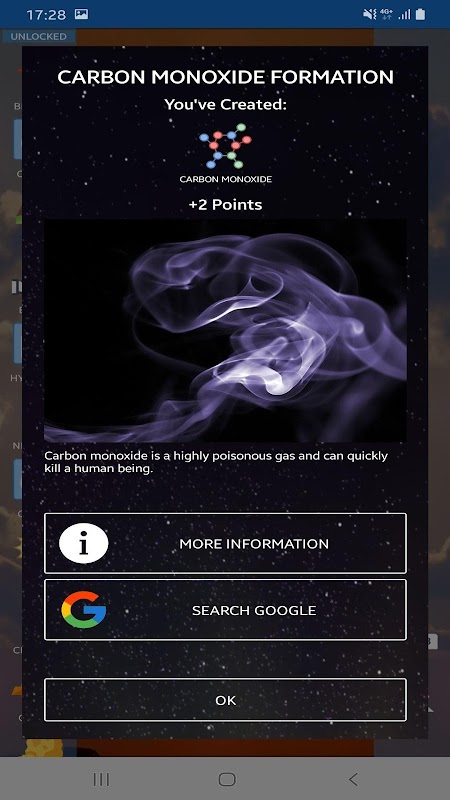You can see basic information about the discovered elements, as well as the Wikipedia page dedicated to each element. Also, when you successfully finish a reaction, you'll see a panel with information about the finished reaction and the products that it created.