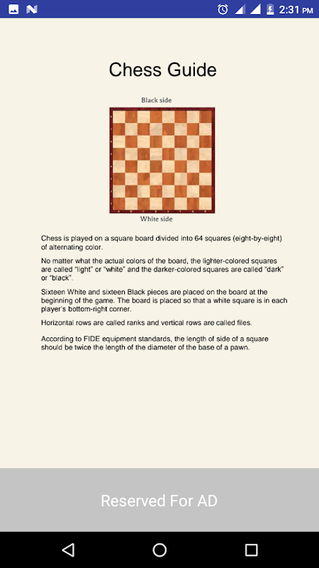 Chess guide app also has information on typical moves that can be applied against formidable players. You can easily know how to play chess and hence enjoy it by simply reading this chess guide. Chess guide app has theoretical section, which explains the methods of the game in a certain stage of the game based on actual example. You are not master in chess game & you cannot win chess game, so you shouldn't worry, because this chess guide app will teach you how to play chess and all Rules & Tips about Chess Game.