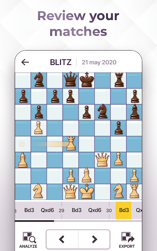 ⬛️⬜️تنوعات لا حصر لها: لا يقتصر الأمر على تحدي لاعبين حقيقيين بمستويات مهارات مختلفة فحسب، بل يمكنك أيضًا اللعب في ثمانية أوضاع مختلفة. العب بليتزات (أو blitzes) بفترات زمنية متفاوتة، واستخدم نظام الإشعارات للعب مع أصدقائك عند اتصالهم بالإنترنت، واختبر قدراتك بشكل خاص ضد الذكاء الاصطناعي للعبة، وشارك في بطولات بأشكال مختلفة ونظمها لمزيد من متعة اللعب الجماعي.