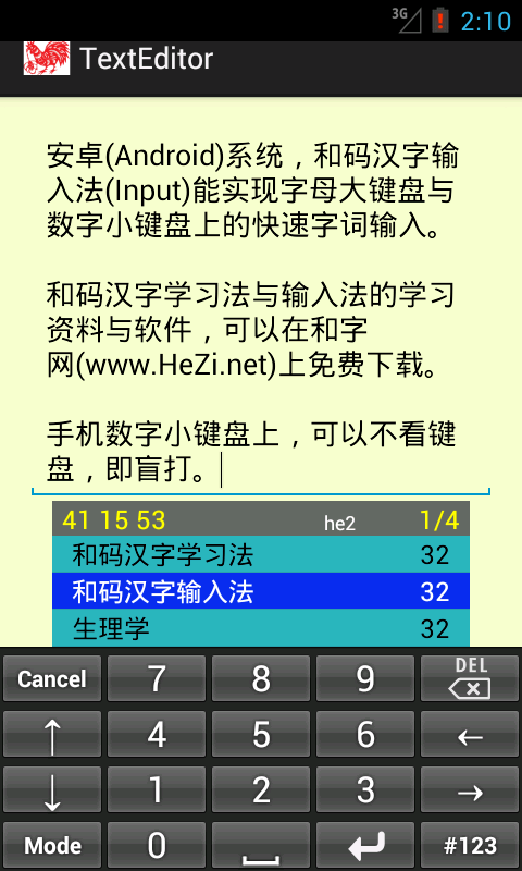 HeInput method can type 21,003 words(only 3,500 words are daily used), 180,000 Phrases, has rich features such as code prompt, PinYin prompt, search words and code by PinYin, linked typing, adding personal phrases, etc.