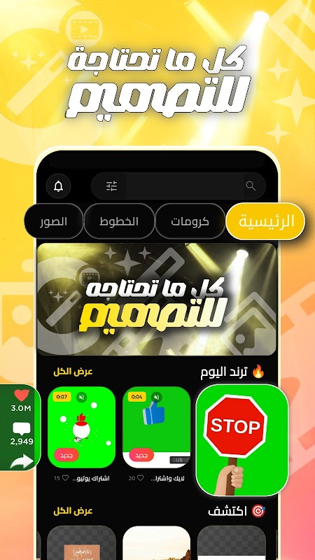 كروماستر (ChroMaster) هو وجهتك الأولى والاحترافية لكل ما تحتاجه في عالم التصميم والمونتاج. يوفر لك التطبيق مكتبة ضخمة ومتجددة يومياً من الملحقات المجانية عالية الجودة.