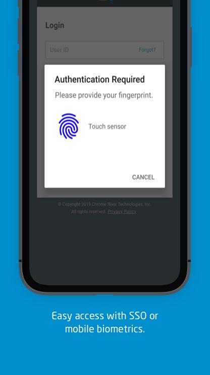 هذا تطبيق محمول اختياري يمكن تنزيله على جهازك الشخصي للمساعدة في توفير وصول أسهل إلى تطبيق الويب Chrome River. لقد سهلنا على مستخدمينا الوصول إلى Chrome River أثناء التنقل من خلال السماح لك بتسجيل الدخول بسهولة باستخدام المصادقة البيومترية أو الاستفادة من إمكانات تسجيل الدخول الأحادي التي تتطلبها مؤسستك.