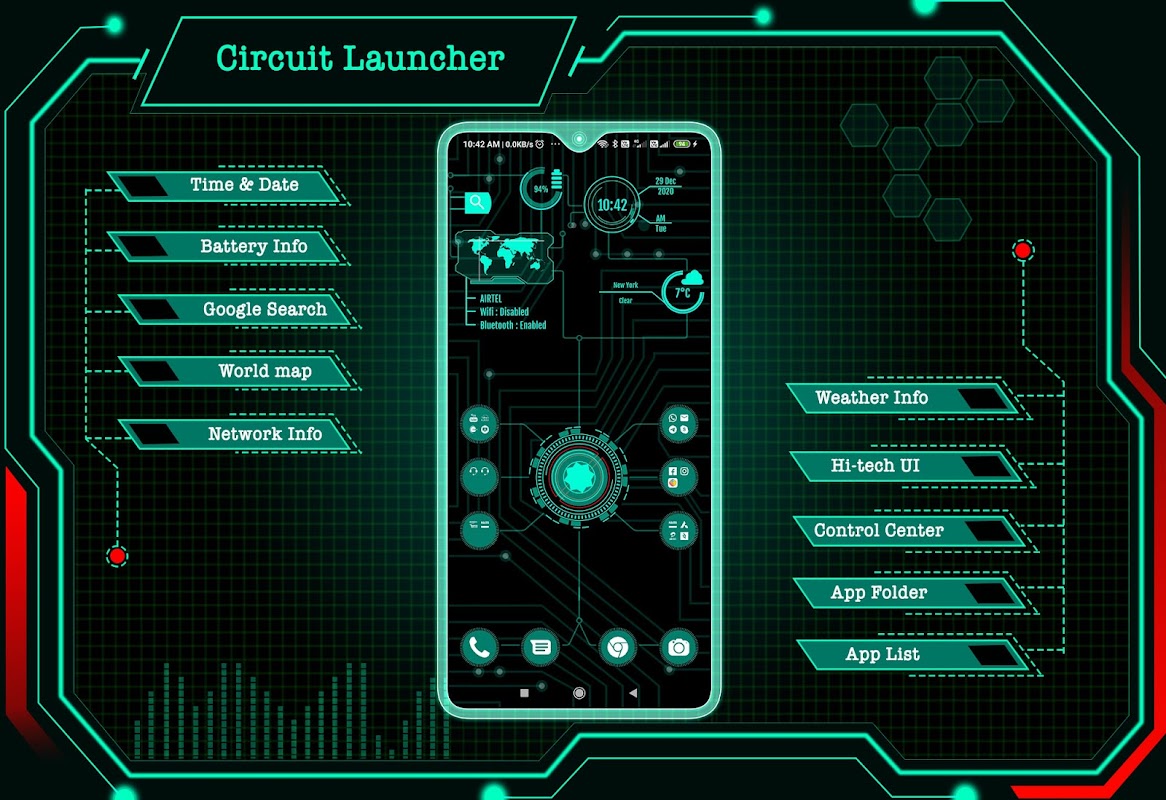 Circuit Launcher هو مشغل سريع وسهل الاستخدام لنظام Android ، مصمم بواجهة مستخدم مستقبلية أو نمط واجهة مستخدم من الجيل التالي ، مع خيارات التخصيص الشاملة الخاصة به. يحول هذا التطبيق هاتف Android الخاص بك إلى مشغل مستقبلي. يتيح لك قول وداعًا لمشغلات التطبيقات القديمة والترحيب بـ Circuit Launcher الجديد والمحسّن - AppLock و HideApp و Hitech Wallpaper و Folder و Themes. مع هذا التطبيق.