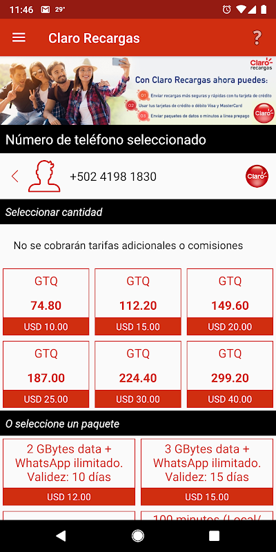 Aplicación oficial de Claro para recargas y compra de paquetes de Internet o llamadas.