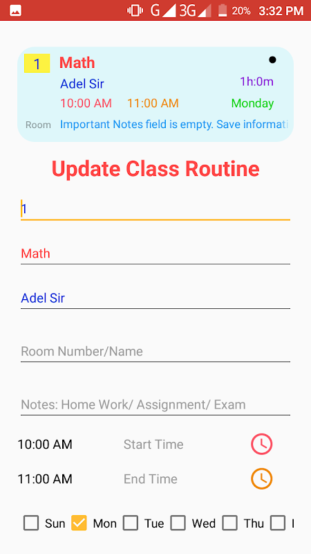 - إضافة اسم المادة، واسم المعلم، ووقت بدء الحصة، ووقت انتهائها.