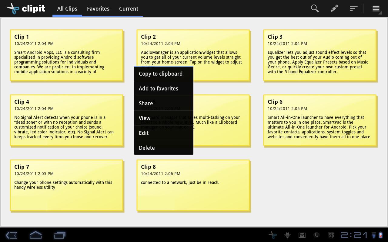 Much like a Clipboard manager on your Mac or PC, ClipIT allows you to copy and manage an unlimited number of items to your clipboard. You can copy, search, star, manage, share, and easily switch between clips all from our easy to use clipboard console or directly through the home-screen widget.