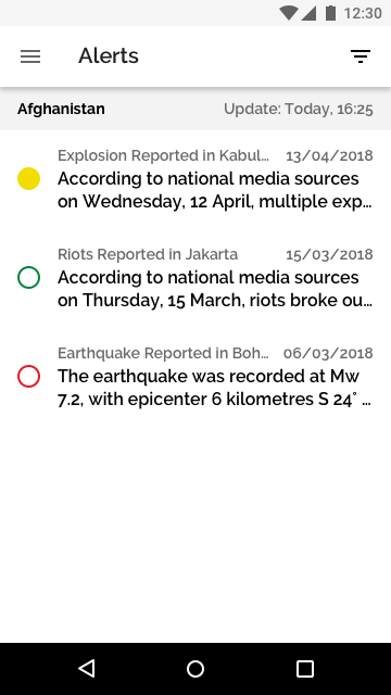 تنبيهات فورية مباشرة إلى هاتفك - في الوقت الحقيقي، والإخطارات متعلقة بالموقع حول المخاطر المحتملة داخل دائرة نصف قطرها اله 50km، مباشرة على الهاتف الخاص بك، مع تقديم المشورة بشأن كيفية تجنبها