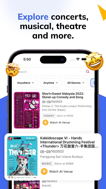 • أضف العروض والأماكن والمنظمين وفناني الأداء المفضلين لديك إلى قوائمك المفضلة