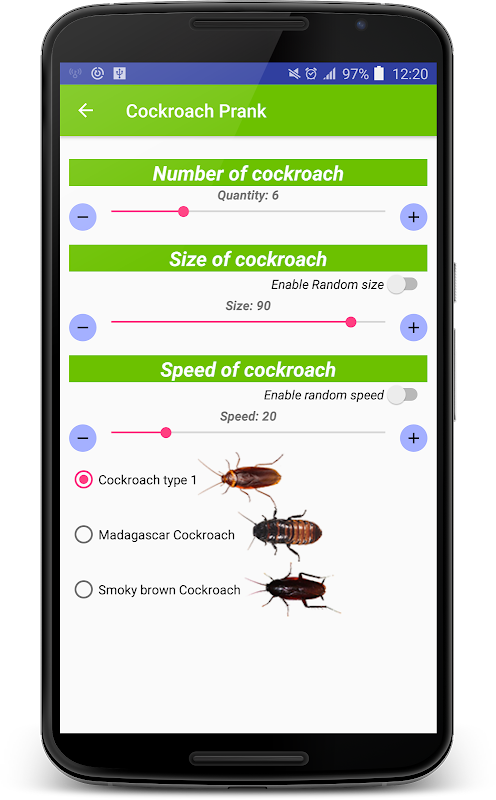 In this app, you will see cockroach run on your phone screen no matter you are listening to music, playing game or surf web. It will be fun to prank your friends and let's see funny joke how they act when see cockroach run all over screen.