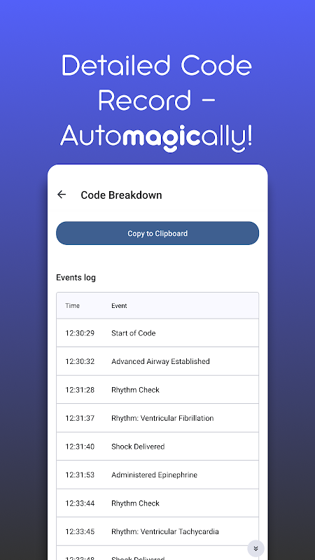 يتم تضمين توقيت الإنعاش القلبي الرئوي وأدوية ACLS الشائعة مع التذكيرات المرئية والمسموعة للمساعدة في تفريغ هذه المهام معرفيًا. علاوة على ذلك ، تسمح وظيفة التسجيل الآلي بتسجيل كل خطوة من خطوات الإنعاش بدقة. يمكن نسخ السجلات إلى الحافظة لأغراض التوثيق. تعكس أي أدوية وتدخلات وجرعات يطلبها تطبيق Code Blue Leader تلك التي أوصت بها أحدث إرشادات جمعية القلب الأمريكية (AHA) ACLS.