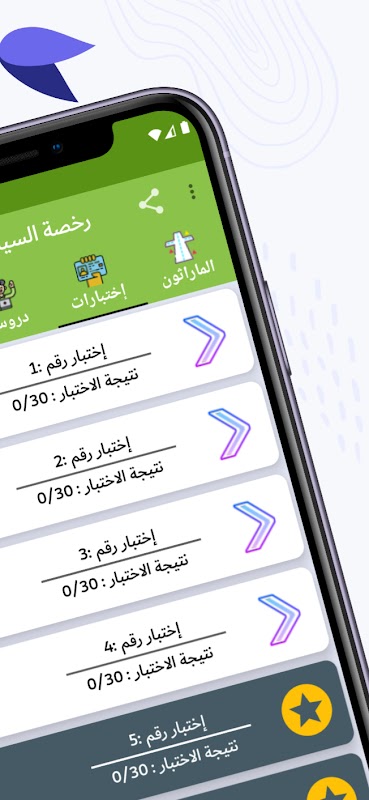 15 اختبار مختلفًا لإمتحان رخصة السياقة و 450 سؤالًا تزداد صعوبة فتحها اعتمادًا على تقدمك