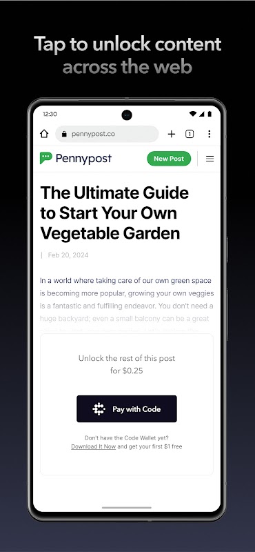سواء كنت تريد فتح مقال واحد تريد قراءته مقابل 0.50 دولار، أو إرسال رسالة شكر بقيمة 5 يورو إلى شخص قدم لك نصيحة رائعة عبر الإنترنت، أو سداد ثمن القهوة التي تبلغ 3 جنيهات إسترلينية لصديقك، يمكنك القيام بذلك باستخدام Code.