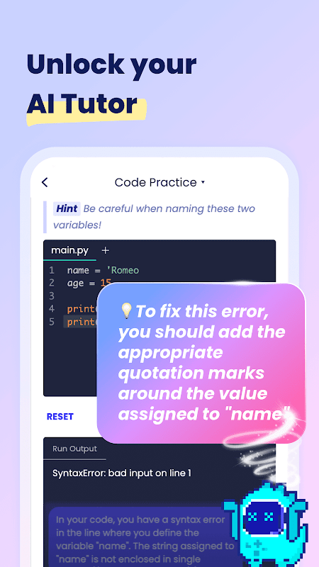تعلم البرمجة من خلال المحادثات التفاعلية والجذابة. يتم تقسيم المفاهيم المعقدة إلى أجزاء صغيرة الحجم، مما يجعلها في متناول الجميع وممتعة.