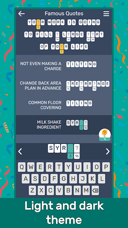 تحتوي العبارات على معلومات شيقة ومفيدة لتوسيع آفاقك وتوسيع آفاقك المعرفية. ستقدم لك لعبة الكلمات حقائق من مواضيع مختلفة: الطعام، الاختراعات، التاريخ، الفضاء، حيل الحياة، الحشرات، الطبيعة، الاقتباسات، حقائق عن الإنسان، إلخ. إنها تشبه الكلمات المتقاطعة، ولكنك ستكتشف شيئًا جديدًا.