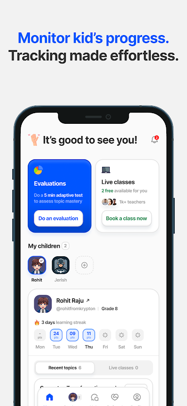 أدواتنا التعليمية - الدروس المباشرة والاختبارات وتقييمات الذكاء الاصطناعي - تعمل معًا لمساعدة طفلكم على بناء ثقته بنفسه، والتفوق الدراسي، والتعلم بوتيرته الخاصة.