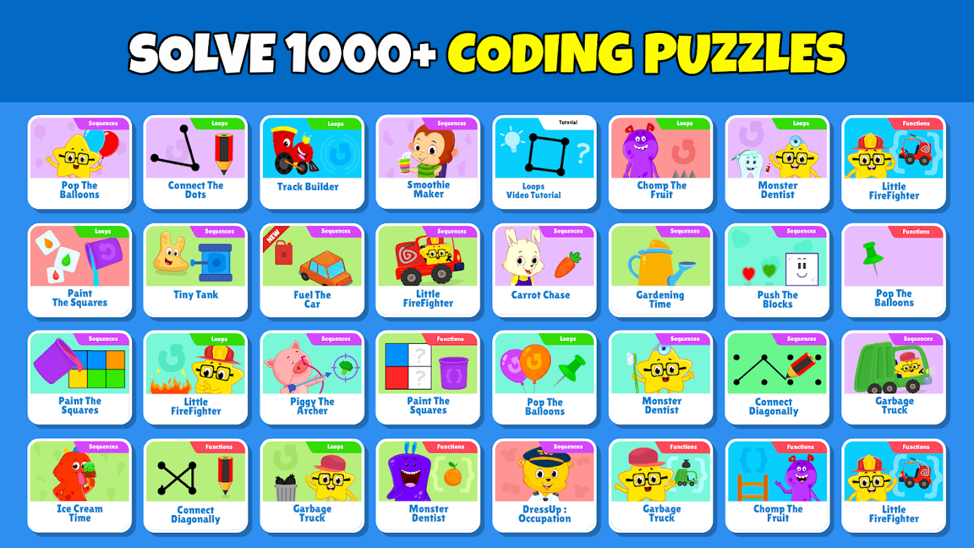 تعلم أساسيات البرمجة، مثل التسلسل والحلقات والوظائف، مع أكثر من 200 لعبة برمجة للأطفال وأكثر من 1000 مستوى مليء بالتحديات.