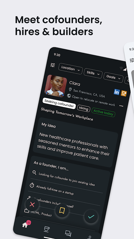 * مطابقة ثنائية: نربط الأشخاص الذين يبحثون بنشاط عن بعضهم البعض، وليس فقط من يستوفون معاييرك. سواء كنت مؤسسًا تبحث عن شريك مؤسس أو موظفًا جديدًا، أو منشئًا يبحث عن الانضمام إلى فريق، فإن كل مطابقة مصممة لضمان التوافق المتبادل.