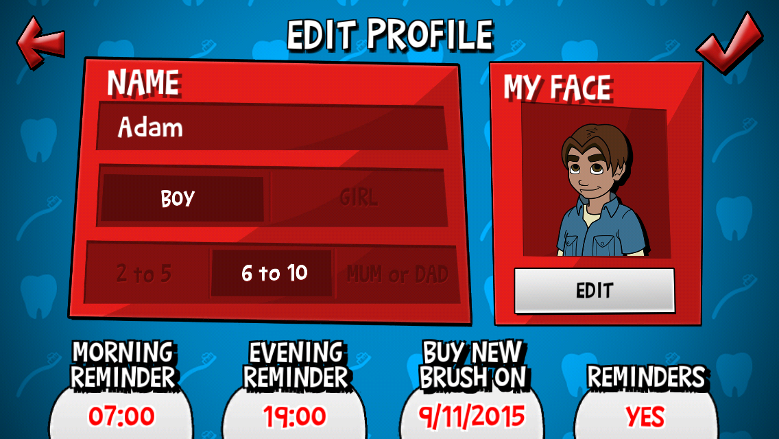• Each brusher in the family can take a photo and put themselves in the game with up to ten profiles to keep up-to-date on how their brushing adventure is going.