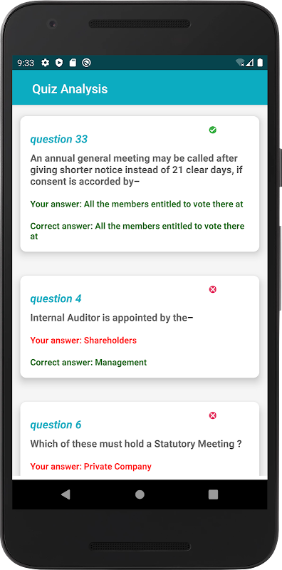 بمجرد أن يقرأ الطالب الملاحظات ، يمكنه المضي قدمًا للانتقال إلى أسئلة اختبار الاختيار من متعدد. يتم اختيار الأسئلة عشوائيًا في كل مرة وبعد كل اختبار ، يتم عرض النتيجة. يمكن للطالب بعد ذلك مراجعة الأسئلة ، ورؤية الأخطاء التي حصلوا عليها وعرض الإجابة الصحيحة لكل سؤال.