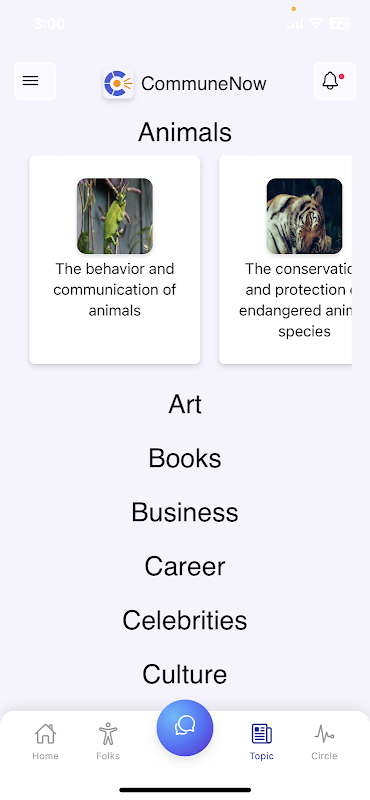 لدينا هدف واحد فقط: مساعدتك على تحدث الإنجليزية. CommuneNow واجهة بسيطة وسهلة الاستخدام. لدينا خمس شاشات رئيسية فقط: الصفحة الرئيسية (حيث ترى التحديثات والأخبار من أصدقائك ومجتمعاتك) ، والأشخاص (قائمة دوائر أصدقائك) ، و CommuneNow (التحدث العشوائي الفوري) ، والدوائر (لإنشاء مجتمعات أو التحدث إلى الناس في مجتمعاتك ) ، والمواضيع (حيث يمكنك اكتشاف موضوعات المناقشة الفريدة لدينا).