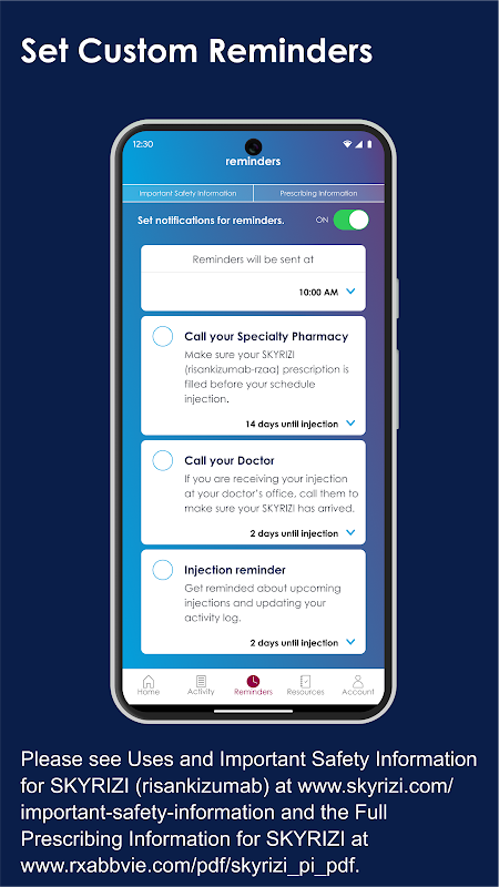 يتميز تطبيق "كومبلت" بتسجيل مُخصص للحقن والأعراض، وتذكيرات بالأدوية، وتحديد الأهداف لدعمك وتشجيعك طوال فترة العلاج. يُبقيك تطبيق "كومبلت" على اطلاع دائم بما يُمكن أن تُقدمه لك HUMIRA وRINVOQ وSKYRIZI.