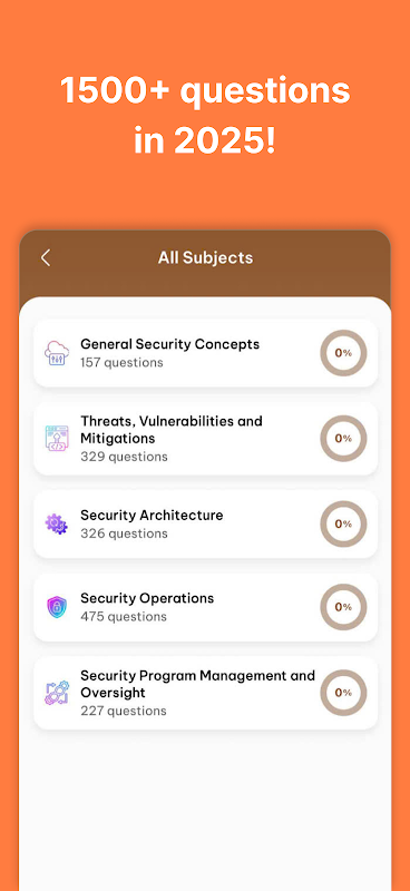امتحان CompTIA Security+ لعام 2025 هو التطبيق الأمثل، إذ يحتوي على أكثر من 1500 سؤال مُحدّث و30 اختبارًا تحضيريًا يُغطي جميع المواضيع، لمساعدتك على الاستعداد واجتياز امتحان CompTIA Security Plus SY0-701 من أول محاولة لك في عام 2025.