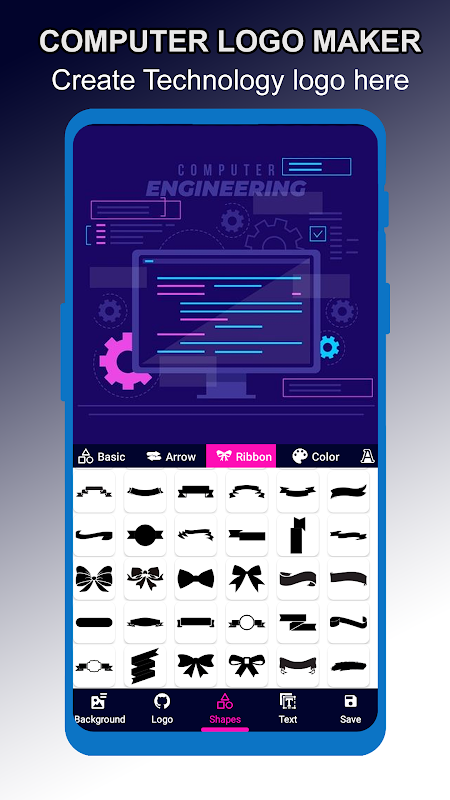 يحتوي تطبيق Computer Logo Maker على جميع الميزات التي تحتاجها لإنشاء شعار ملهم. بدءًا من تحرير النص وحتى تعديل الخلفية وتخصيص الشكل والنمط ثلاثي الأبعاد والمزيد.