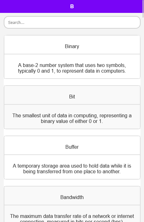 وظيفة البحث: يحتوي تطبيق قاموس علوم الكمبيوتر هذا على ميزة البحث. ابحث عن المصطلح أو المفهوم الدقيق الذي تحتاجه من خلال ميزة البحث القوية لدينا. سواء كنت تبحث عن تعريف محدد أو تستكشف موضوعات جديدة، فإن أداة البحث لدينا توفر نتائج سريعة ودقيقة.