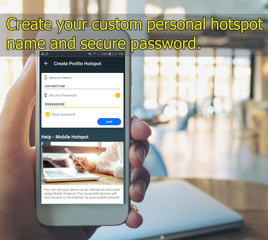 إذا كان لديك غير محدود شبكة البيانات المتنقلة يمكنك حفظ استخدام البيانات من عائلتك أو الأصدقاء مفضلة من قبل هذا التطبيق وسهولة الاستخدام. متوفر الآن التطبيق الساخنة واي فاي مجانا لتمكن أي الهواتف الذكية الروبوت كنقطة اتصال محمولة متنقلة. تكون قادرة على بث شبكة واي فاي بؤرة من هاتفك المحمول الشخصي لأجهزة الكمبيوتر الشخصية، أجهزة الكمبيوتر المحمول، أجهزة الكمبيوتر المحمول أو أي نظام تشغيل جهاز آخر تكون قادرة على تلقي إشارة واي فاي.
