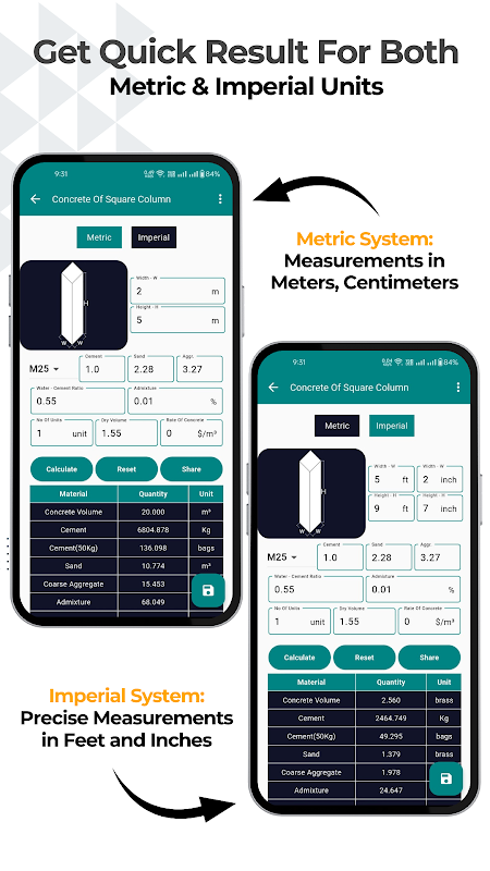 تطبيق الهندسة المدنية ، آلة حاسبة للبناء ، الخرسانة ، الكمية ، الفولاذ ، المقدّر