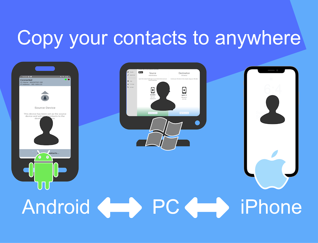 Contact Transfer هو تطبيق مدير جهات اتصال قوي يسمح لك بنسخ جهات الاتصال بسرعة وسهولة من جهاز Android الخاص بك إلى أجهزتك الأخرى - هاتف آخر أو إلى جهاز الكمبيوتر الخاص بك. يمكنك نسخ جهات الاتصال من Android إلى Android ، وبين أجهزة Android و iOS عبر جهاز الكمبيوتر الخاص بك.
