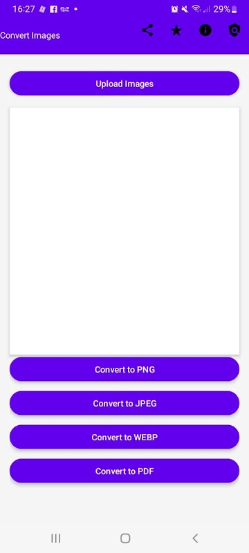 هذا التطبيق عبارة عن **أداة لتحويل الصور** إلى تنسيقات مختلفة مثل **PNG**، **JPEG**، **WEBP**، أو تجميعها في ملف **PDF** واحد. ويتميز بواجهة بسيطة تسمح للمستخدمين بتحميل الصور وتحويلها. ويمكن للمستخدمين تحميل مجموعة من الصور من معرض الهاتف أو وحدة التخزين الداخلية، ويدعم التطبيق تحميل صور متعددة في وقت واحد. فهو يحول الصور بكفاءة إلى التنسيقات التالية: **PNG**، **JPEG**، **WEBP**، و **PDF**، مما يجعله حلاً متعدد الاستخدامات لتحويل الصور.