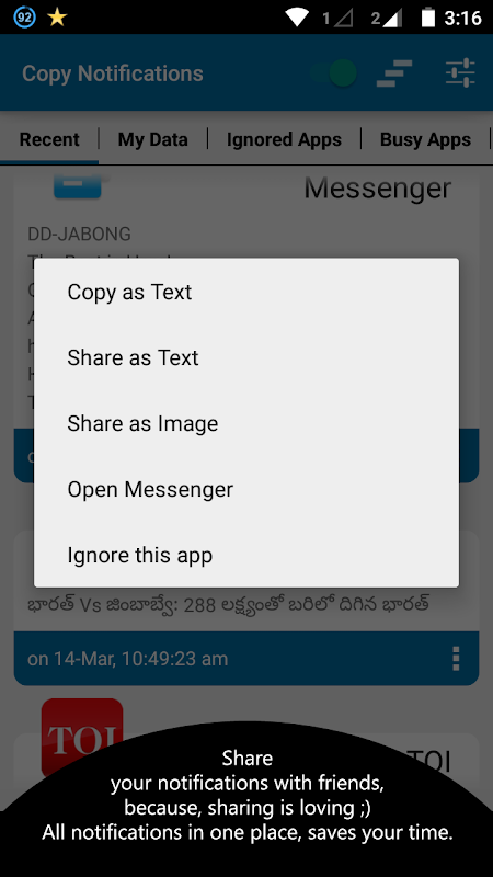 *Gives option to share any notification as Text or Image