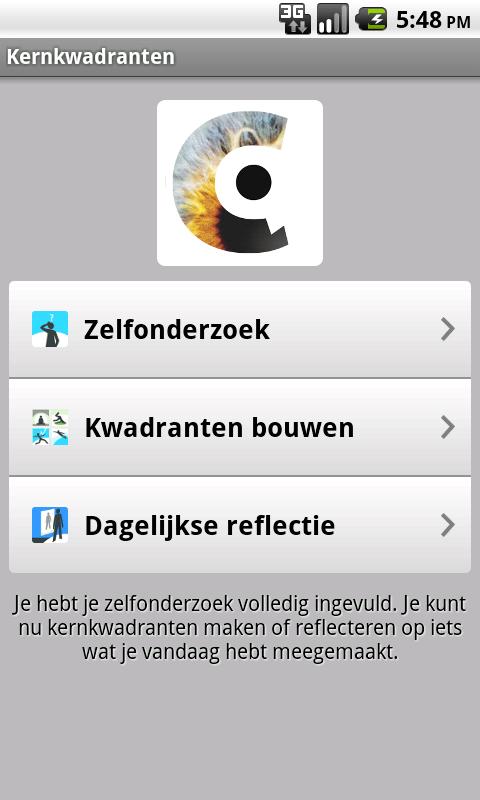 ما يجعل هذا التطبيق فريدة من نوعها، هو انعكاس اليومي حدة، والتي تمكنك من التفكير في التفاعلات اليومية مع الآخرين أو السلوك الخاصة بك. سيقوم التطبيق ثم ابحث عن ارتباطات بين الأرباع الأساسية التي قمت بها في وقت سابق والمشكلة التي انعكست على. فإنه إما ثم تعطيك التغذية المرتدة أو دعوة لك لجعل رباعي النواة الجديدة. تم تصميم التطبيق لمساعدتك على ترجمة رؤى الأولي الذي حصلت عليه عندما كنت بنيت الخاص الأرباع النواة الأولى، في الممارسة اليومية، من أجل الاستفادة من زيادة awarenes الخاص بك. في مكان ما في آخر كتاب دانيال Ofman على الصفات الأساسية "فانسي اجتماع لي هنا ..!؟" فإنه يتم المذكورة: "إن العالم لا انتظار الناس لتصبح على بينة من الصفات الأساسية منها إن العالم ينتظر الناس الذين هم على استعداد لتقديم وعيهم انتاجيه والتفاعلات ذات مغزى عندما التوعية عن نفسك له أي تأثير على ما تفعله. وكيف التعامل مع الناس، وبناء رباعي النواة لا معنى له، وهو ممارسة غير مجدية ".