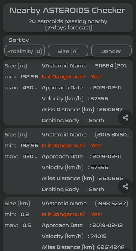 قسم مدقق قرب الكويكب - أداة تعطي معلومات مفصلة عن الاسم والحجم والقرب من الأرض وتفاصيل أخرى للكويكبات القريبة التي تم اكتشافها في الأيام السبعة التالية.