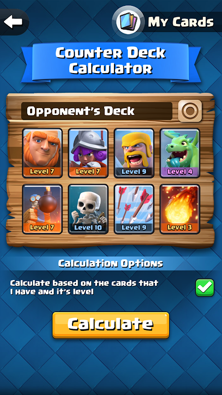 من خلال توفير سطح خصمك، ومكافحة الطابق حاسبة تحليل، وحساب واقتراح أفضل سطح السفينة بالنسبة لك لمواجهة سطح خصمك. كما يمكنك إعداد "الجرد بطاقة" عن طريق ملء جمع بطاقتك في صراع رويال. بهذه الطريقة، سوف يستند حساب مكافحة سطح السفينة على جميع البطاقات التي لديك وانها مستوى في صراع رويال.