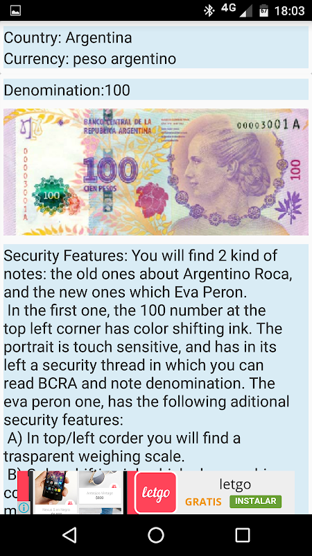 وقد تم اختبار هذا التطبيق على فواتير من 100، 50، 20، 10 و 5 بيزو أرجنتينية، وعلى حد سواء للأشعة فوق البنفسجية وكشف عن العلامة المائية يعمل كبيرة معهم.