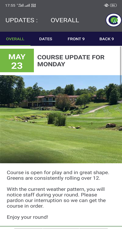 Course Conditions is the easiest way to stay connected to how your golf course is currently playing. Get live updates from your superintendent on all aspects of the operation through the Updates section and through use of Push Notification Alerts. From frost delays to green speeds, Course Conditions is what the best courses use to keep membership informed.