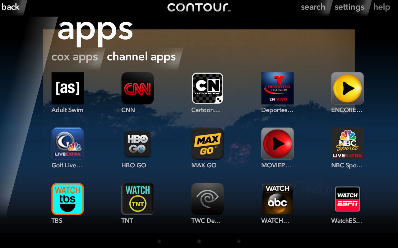 With the Contour App from Cox, you can watch live TV and On Demand shows on your Android tablet anywhere in your house. It also offers access to mobile apps from popular TV networks to watch anywhere: