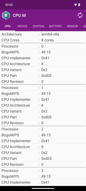 CPU-M هو تطبيق يوفر العديد من المعلومات حول الجهاز، مثل وحدة المعالجة المركزية والنظام والبطارية والمستشعر والمزيد.