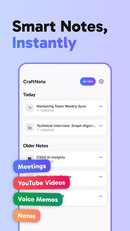 يساعدك تطبيق Craftnote Smart AI Note Taker على تسجيل الملاحظات الصوتية، ونسخ الاجتماعات عبر الإنترنت، وتنظيم الملاحظات المدرسية، وإنشاء ملخصات ذكية. يجعل تطبيق AI Note Taker ملاحظاتك أكثر ذكاءً وسهولة في الإدارة. إنه تطبيقك الشامل لملاحظات الذكاء الاصطناعي.