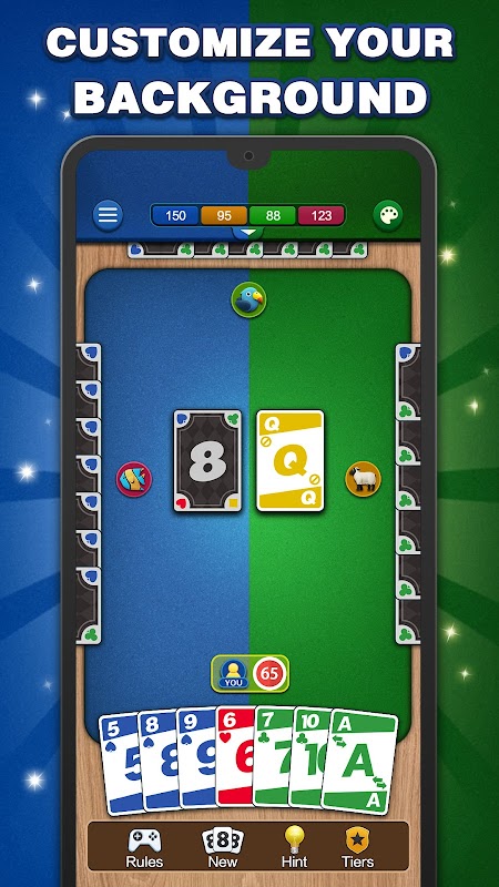 اختبر مهاراتك واستراتيجياتك أثناء لعب Crazy Eights، واستعد لتحديات شيقة، وتفوق على خصومك، والفوز باللعبة.