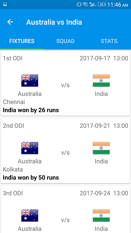 - Series - Complete information of ongoing series: Fixtures, Squads, Stats