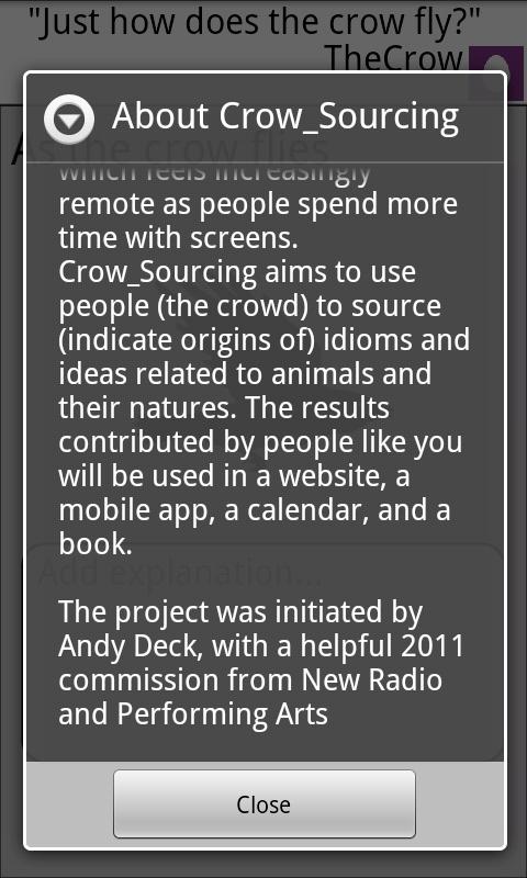 Crow Sourcing aims to use people (the crowd) to source (indicate origins of) idioms and ideas related to animals and their natures.