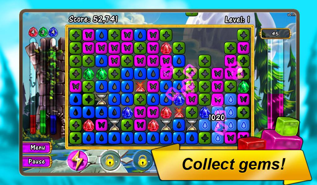 In Arcade mode click to remove groups of 3 cubes of the same color to recharge your powerups and collect gemstones. Use your lightning bolts, bombs and various other powerups to destroy cubes or collect gems, but watch out for items in the grid which can damage you.