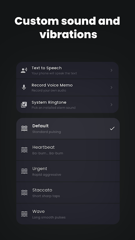 اضبط تذكيرات لمرة واحدة، أو روتينات أسبوعية، أو مؤقتات عد تنازلي في ثوانٍ. أضف أيقونات وصورًا وأصواتًا واهتزازات وخيارات إشعارات متقدمة أخرى لتسهيل ملاحظة كل تذكير والتعامل معه.