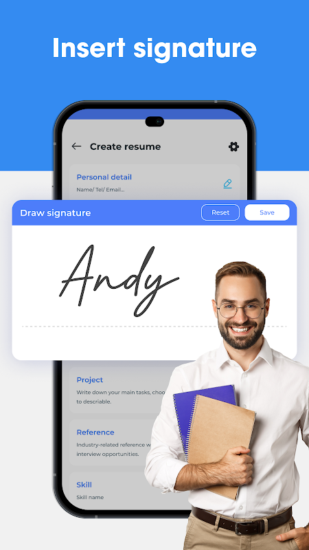 يمكّنك هذا البرنامج من إضافة توقيعك إلى سيرتك الذاتية. يمكنك إدخال أي توقيع تريده باستخدام تطبيق السيرة الذاتية المذهل هذا.