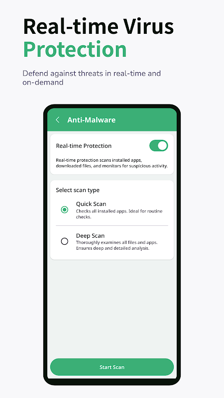 قم بإجراء عمليات فحص في الوقت الفعلي وعند الطلب للتطبيقات والملفات والإعدادات. اكتشف المحتوى الضار وقم بإزالته للحفاظ على بيئة أكثر أمانًا لجهازك ومعلوماتك الشخصية.
