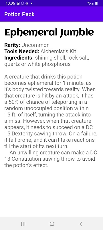 D&D 5e Potion Pack هو تطبيق adnroid يحتوي على مجموعة من الجرعات المخصصة لاستخدامها في المعسكرات المنزلية Dungeons & Dragons! يتضمن نظامًا كيميائيًا ، مكتملًا بمكونات فريدة يمكن العثور عليها ، وأكثر من 100 جرعة يتم تصنيعها!