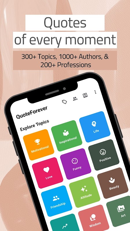 تطبيق QuoteForever ليس مجرد تطبيق عادي لجمع الاقتباسات، بل هو منصة شاملة للاقتباسات، حيث يمكنك استكشاف مكتبة واسعة من الاقتباسات المتعلقة بالموضوعات، والمؤلفين، والمهن. سواء كنت طالبًا، أو معلمًا، أو رائد أعمال، أو فنانًا، أو ببساطة شخصًا يحب قراءة الكلمات المُلهمة، فإن هذا التطبيق يضع لك حكمة مختارة بعناية في متناول يدك.